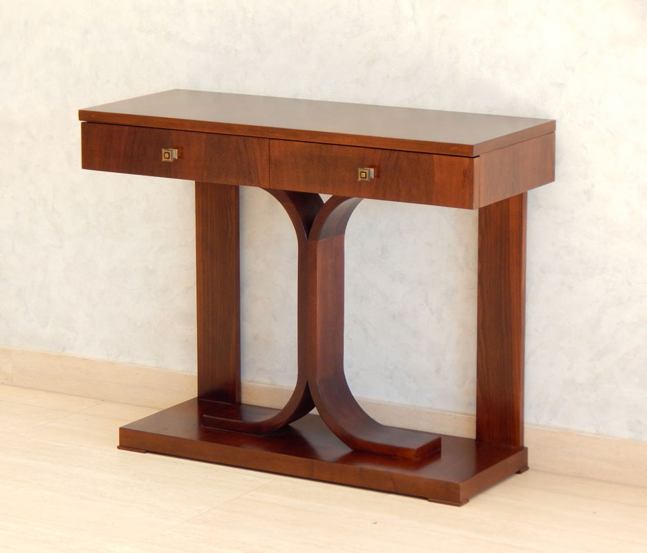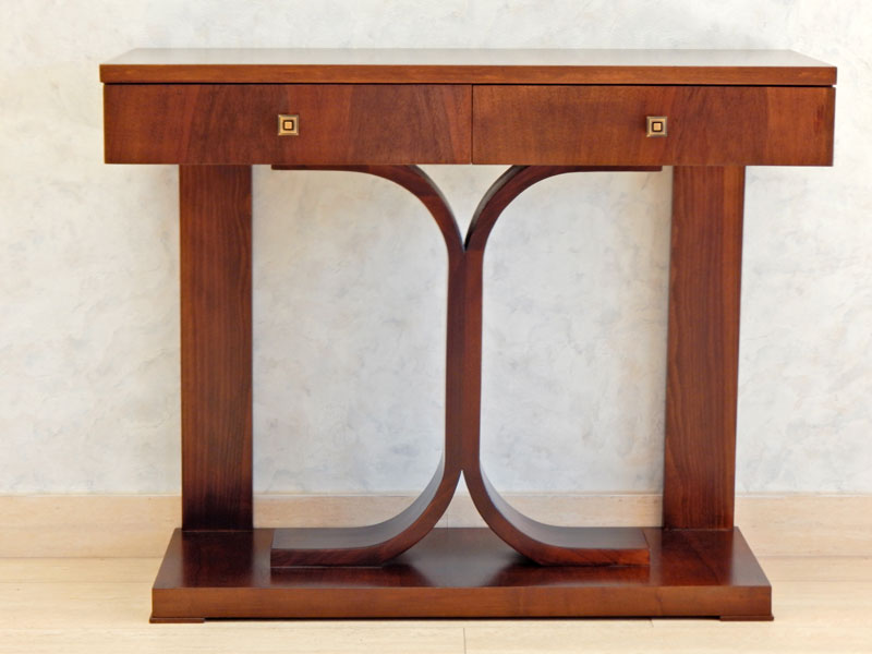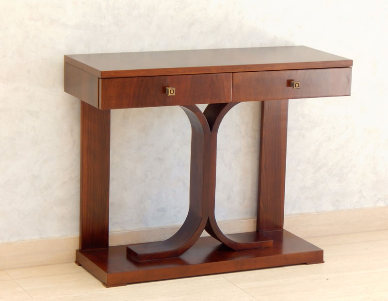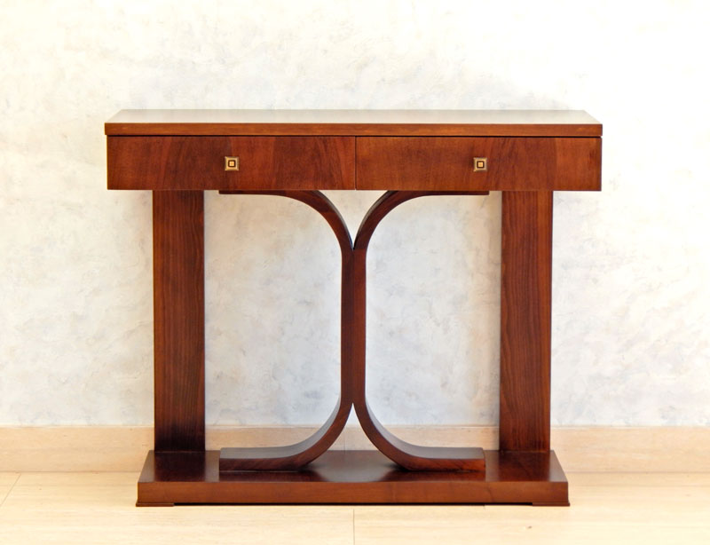 Art Deco 2 fiókos konzolasztal [B-25] Árukód : [B-25] Ár: 265 000 FtDiófa, mahagóni vagy paliszander borítással, íves diófa lábakkal, 2 db fiókkal.Mérete: 85 x 35 cm, magassága: 77 cm.A méret és formaváltozás 10 – 30 % felárat jelent.