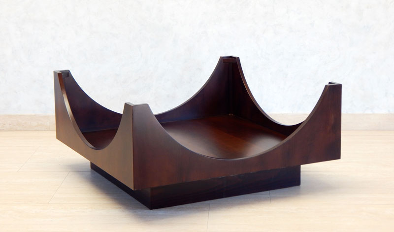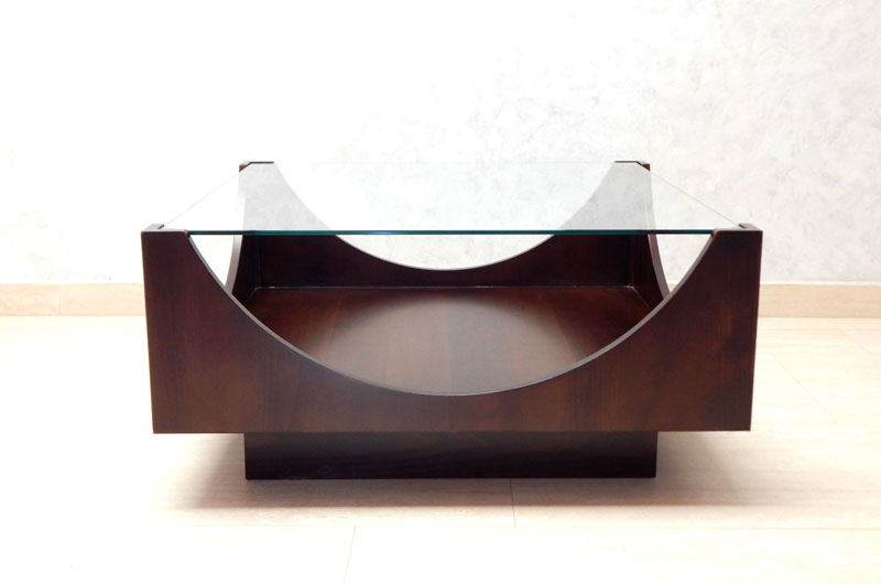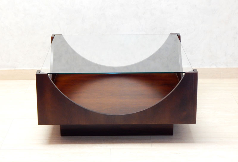 Diófa borítással, íves diófa kávával, alul tárolóval, a tető 8 mm es csiszolt üveglappal.