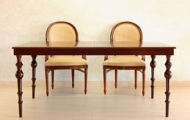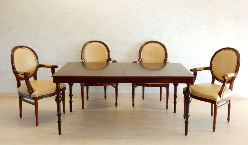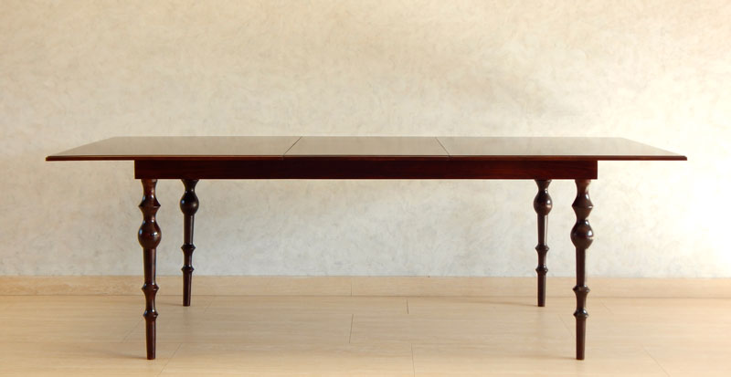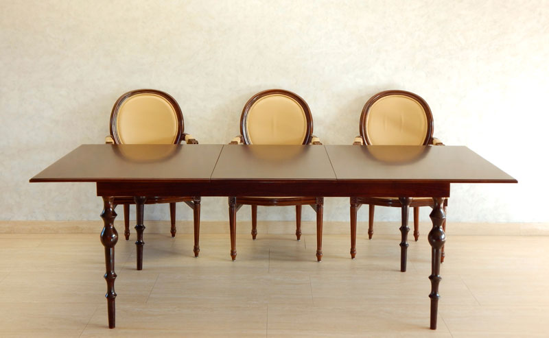 Dió, cseresznye vagy mahagóni borítással, esztergált diófa lábakkal, bővíthető vendéglappal.