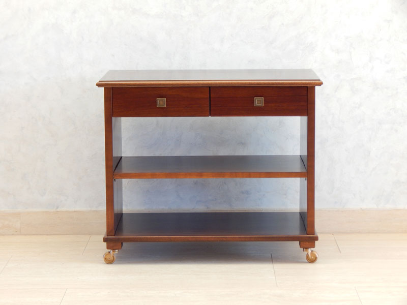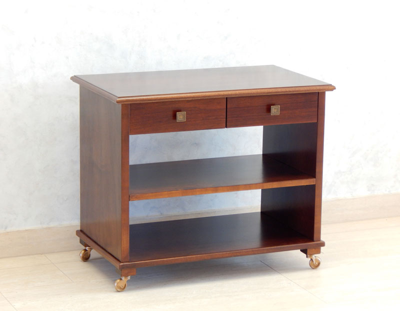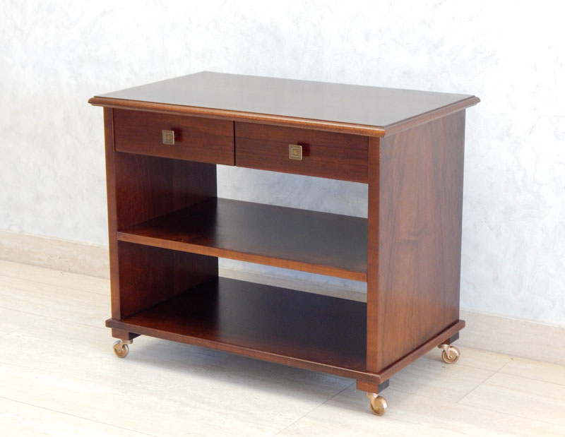 Art Deco zsúrkocsi [M-05] Árukód : [M-05] Ár: 225 000 FtDiófa vagy mahagóni borítással, 2 db fiókkal, 1 db polccal, nyitott hátfallal,görgős lábakkal.Méret: 75 x 45 cm magasság: 65 cmA méret és formaváltozás 10 – 30 % felárat jelent.