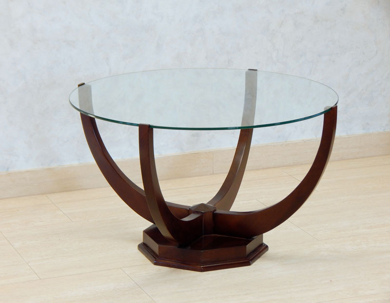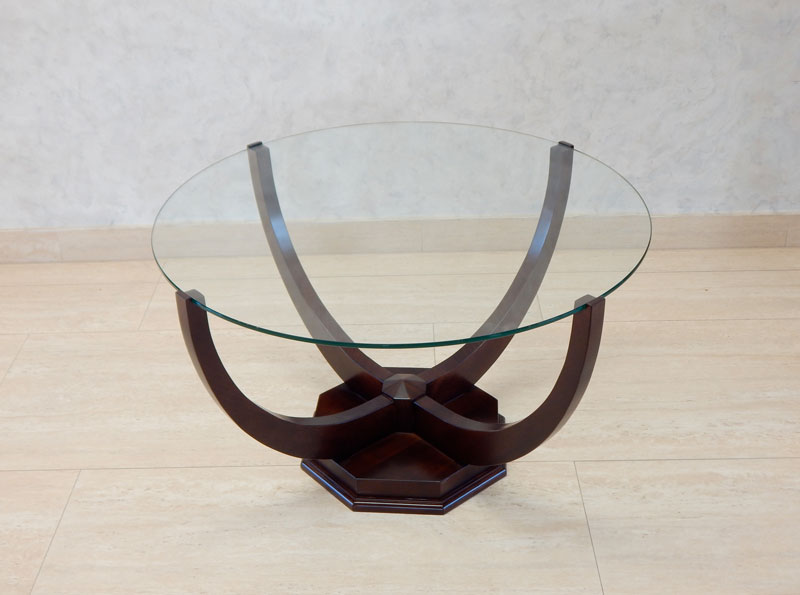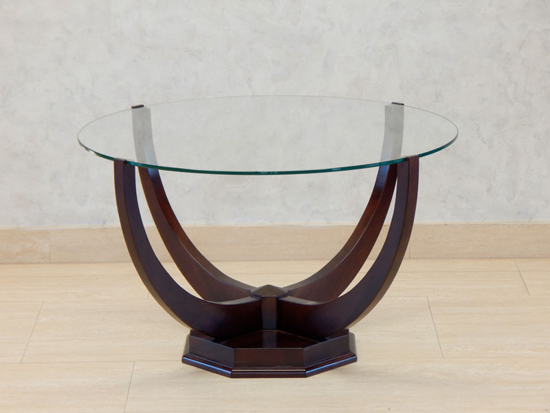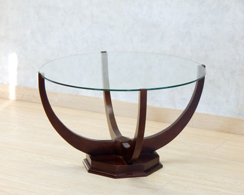 Diófa, mahagóni vagy paliszander borítással, íves lábai diófából készül. Az üveglap 8 mm vastag és az éle csiszolva van. Mérete: Tetőátmérő: 80 cm, magassága: 50 cm.