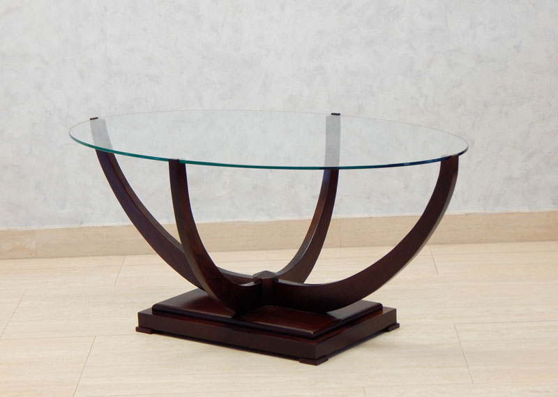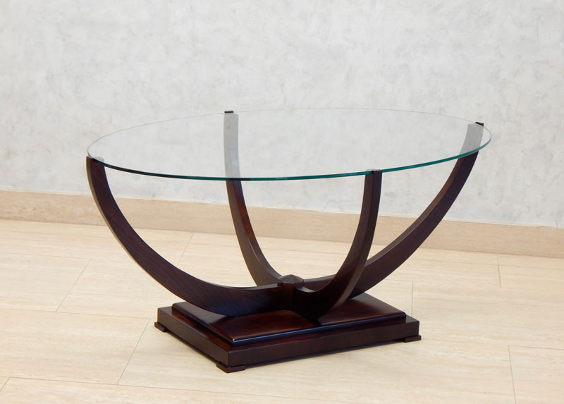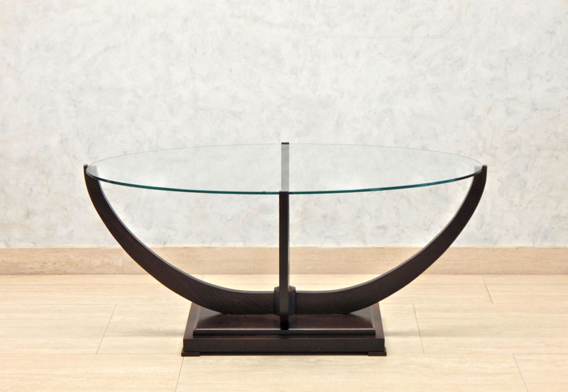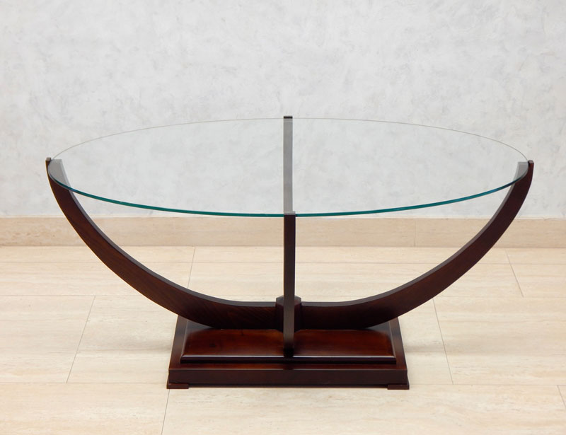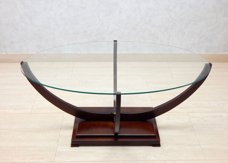 Diófa, mahagóni vagy paliszander borítással ,íves lábai diófából készül. 8 mm ovális üveglappal, széle csiszolva. Mérete: 110 x 65 cm, magassága: 50 cm.