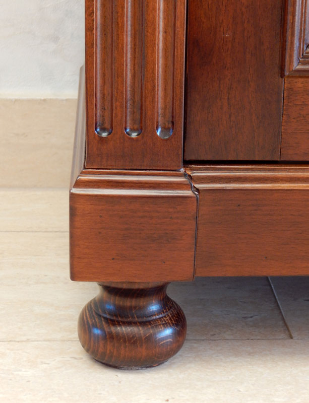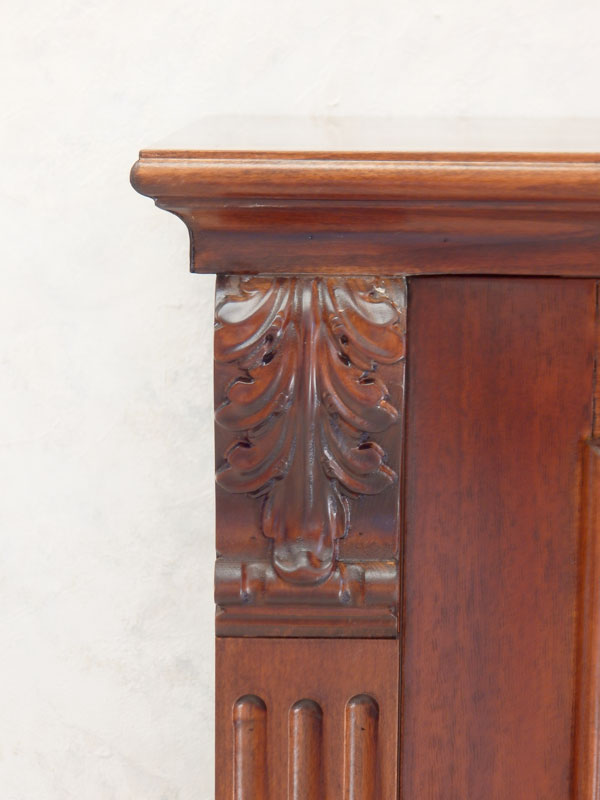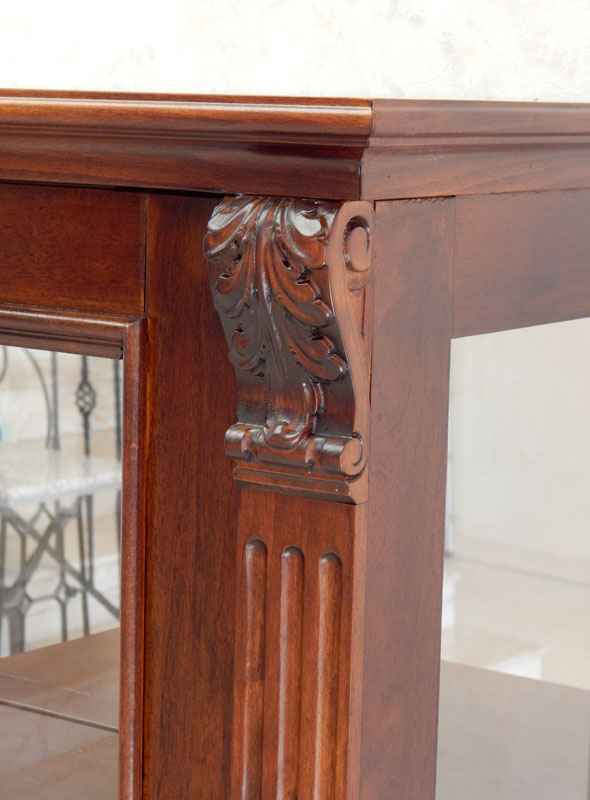 Diófa vagy cseresznyefa borítással, akantuszleveles faragással, tükrös hátfallal, 3 db polccal. Polcmagasság: 40,35,35,32.